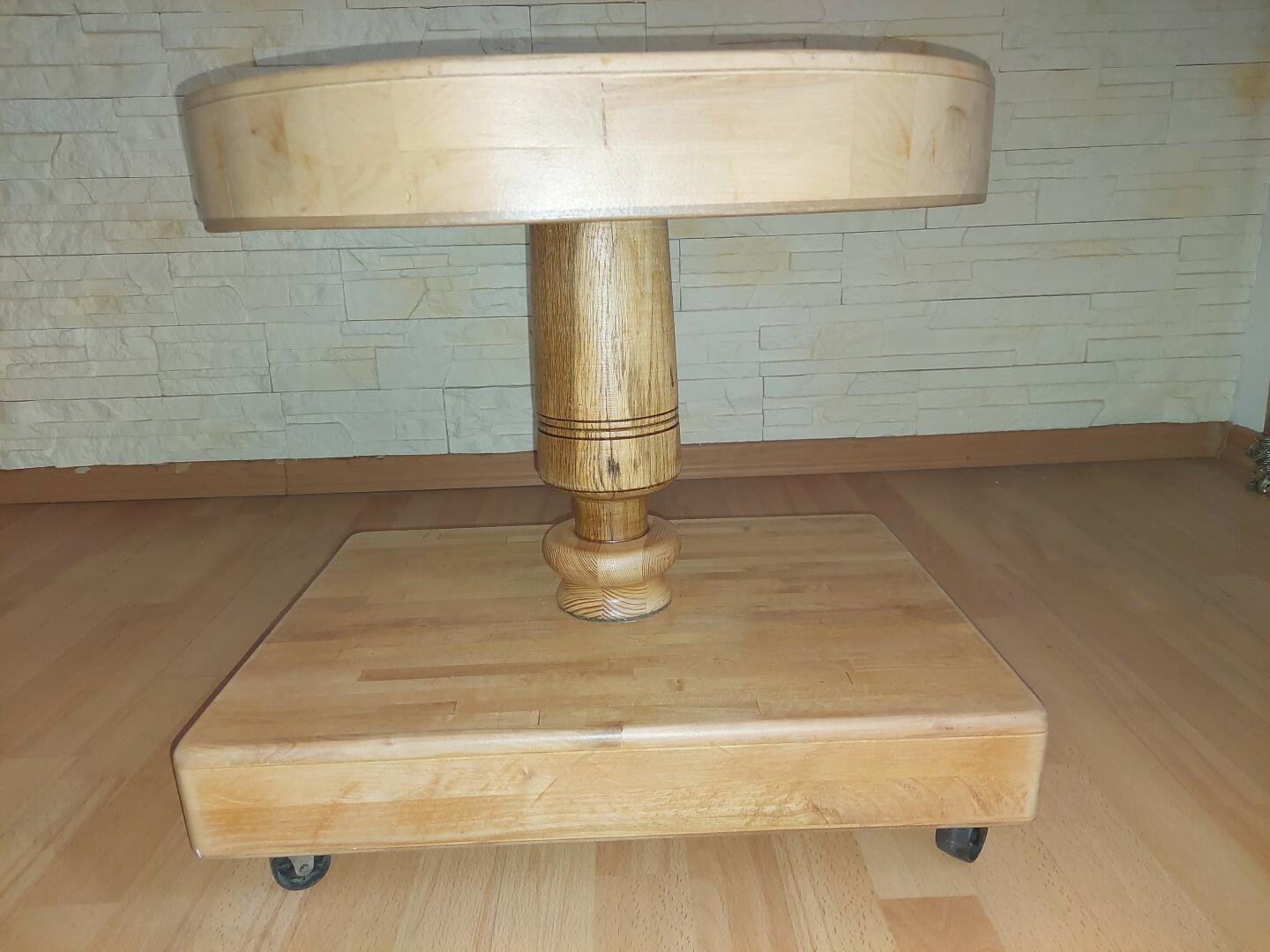 Zaś stolik kawowy jest wykonany ze sklejonych kostek różnych kostek różnych drzew jest na kółkach gdyż jest dość masywny blat jest obrotowy